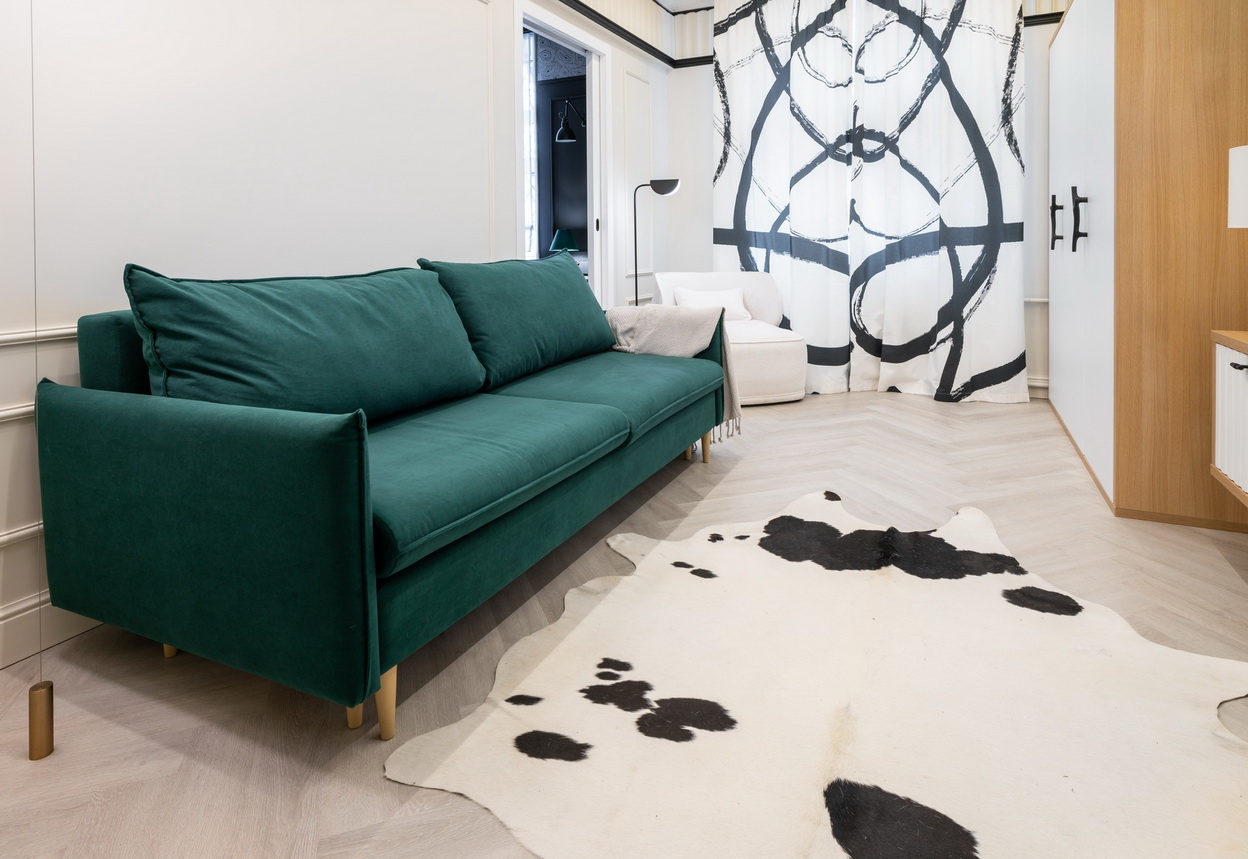 Первым делом дизайнер Ирина Райхер избавилась от многоцветной палитры в гостиной, оставив два основных – черный и белый. При этом, как и хотели герои, в гостиной остался главенствовать белый цвет. А в спальне — черный.