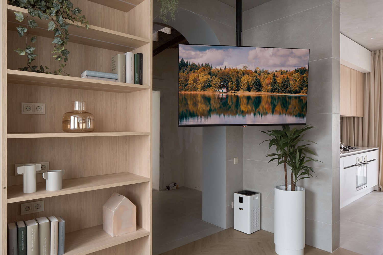Новая кухня-гостиная стала большой песочницей – интерактивной, безопасной и антивандальной, учитывая особенные потребности самого младшего члена семьи. Стол научился левитировать, телевизор – мигрировать, а антресоль – зонировать.